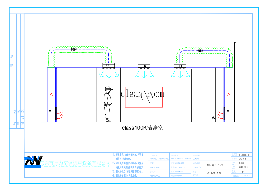 潔凈度的實現(xiàn)是通過布置在車間上的FFU高效過濾送風(fēng)單元過濾,足夠的換氣次數(shù)來實現(xiàn)的,新風(fēng)采用初效過濾后送入車間。